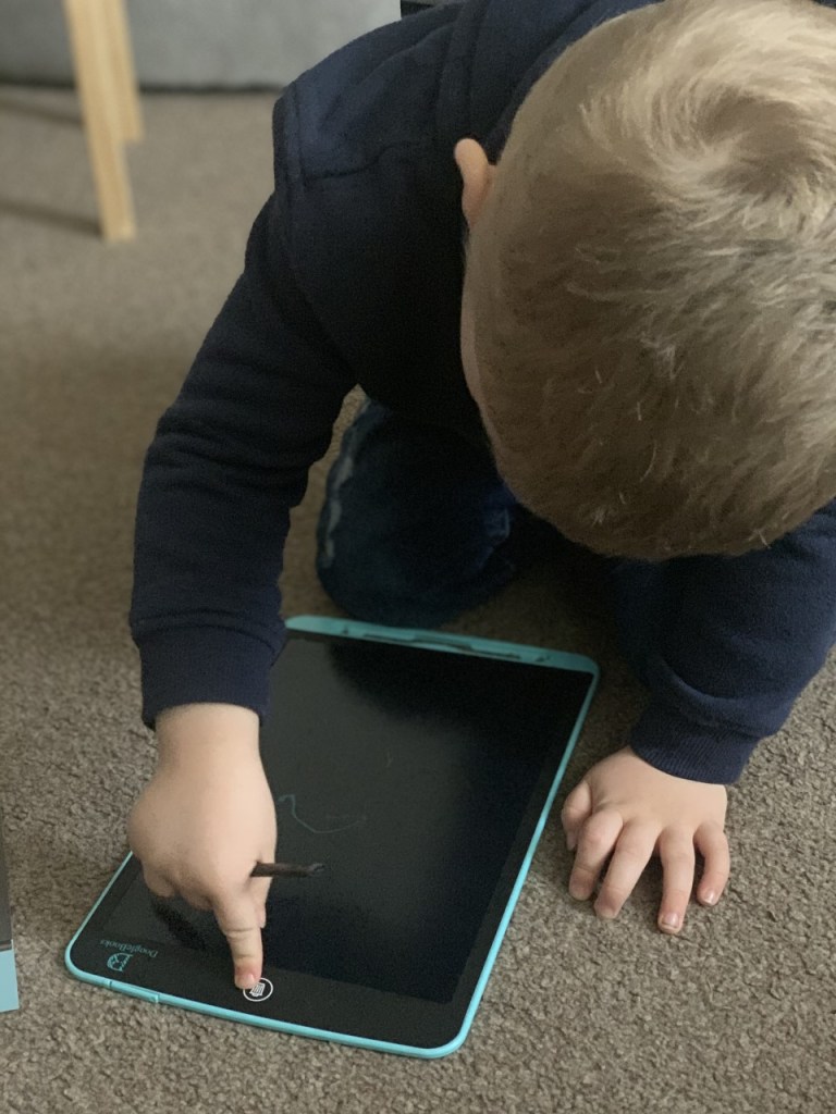 Today we received another great product! The LCD Colour screen from Dooglebooks this is a great item for people age 3-93! Oscar loves to draw so we were very excited when a collaboration was made. The screen itself is of great quality lightweight and easy to use. It comes with a protective case with a sleek design it is just great! Oscar took straight away to drawing on it looking at all the different colours and the marks he can make. We decided to draw some shapes and Oscar’s name to get that bit of extra learning for him. The stylus is easy to hold is very responsive on the screen and the erase button on the top of the screen is a good and easy function for Oscar to use. He really enjoyed the pictures he could make and the different colours.