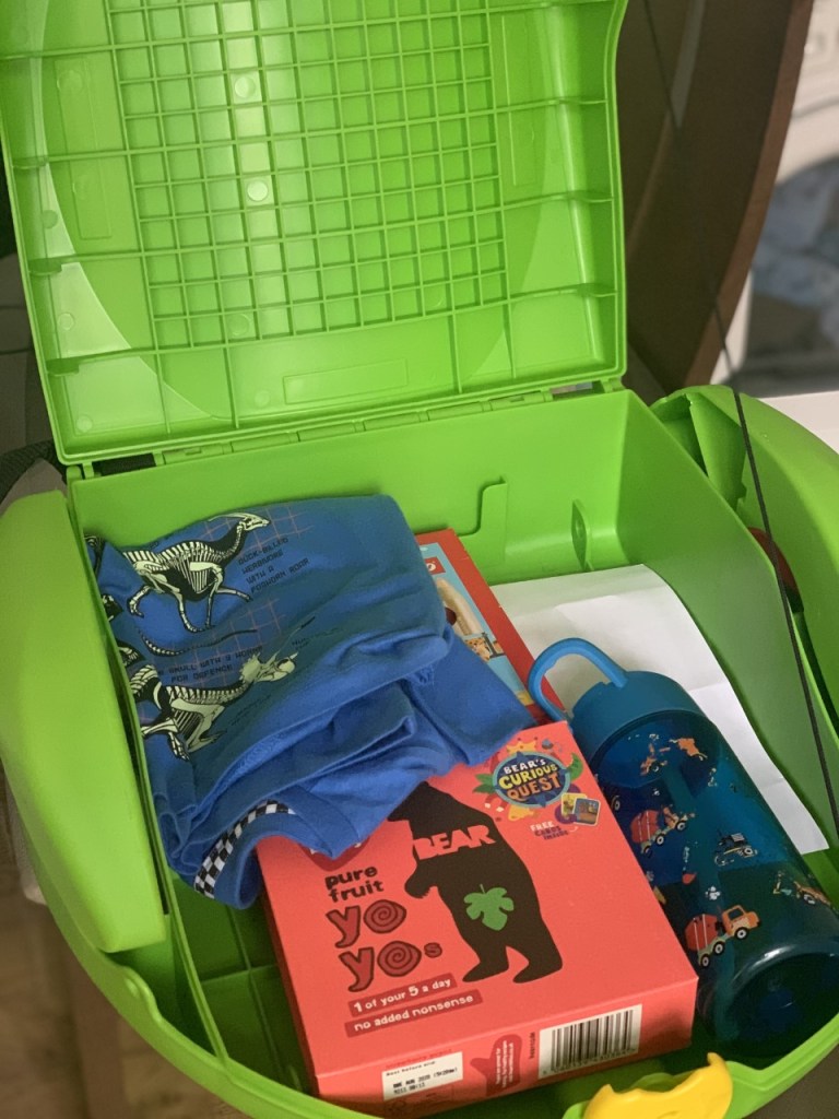 Today we received a lovely product, a CarGO seat. This nifty little product has many functions. It’s main one is to be a booster seat for the car, however Oscar is below the height and weight guidelines so we won’t be reviewing it for this purpose. Oscar chose his own colour green as he it’s his favourite however it does also come in blue, pink and purple. Its sturdy and yet lightweight and Oscar was able to easily manoeuvre it around. The handle is at a great height for pulling along and the plastic is sturdy. Oscar uses it to sit up at the table to have meals and snacks, the seat allows him to do this he is comfortable as he is at the same height as if he were kneeling as he previously did but this way he can focus on eating rather than balancing! The storage space is amazing inside the seat, here we have a drink and some snacks,a change of clothes and his current prize possessions his paper and pencils. This still left loads of room for more snacks or toys.
